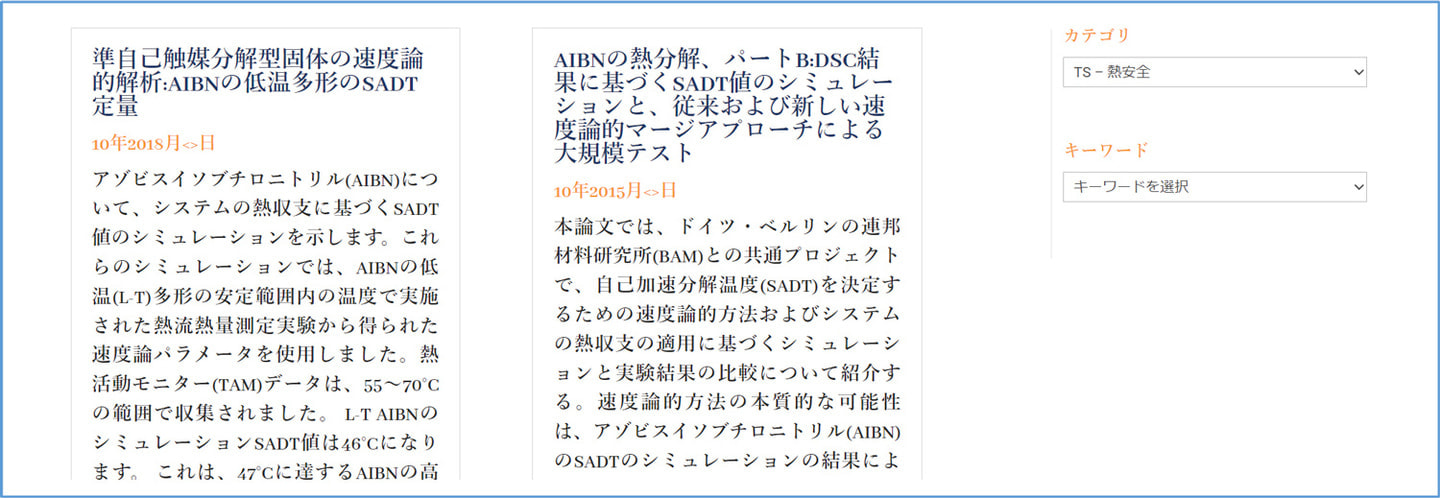 当 HPからこれら投稿論文を簡単に検索できるようにしました。 カテゴリの ”TS 熱安全 ”を検索すると AKTSが投稿した論文を含めて 15件の科学論文が閲覧できます。