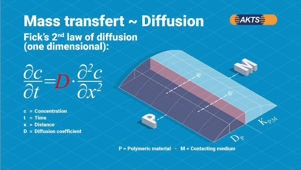 ポリマー内部の有機物質(Migrant)が物質移動する拡散現象であり、Fickの第2法則に従うとされています。Fig_01の赤文字のDは拡散係数です。