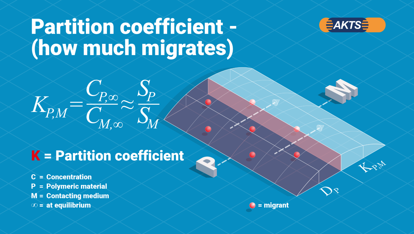一方で食品接触溶媒(疑似溶媒)にどれくらいの量が移行するか?を決定するのが分配係数です。移行物質(Migrant)と疑似溶媒(Simulant)の間の分配係数KP,Mを推定する手法が重要です。